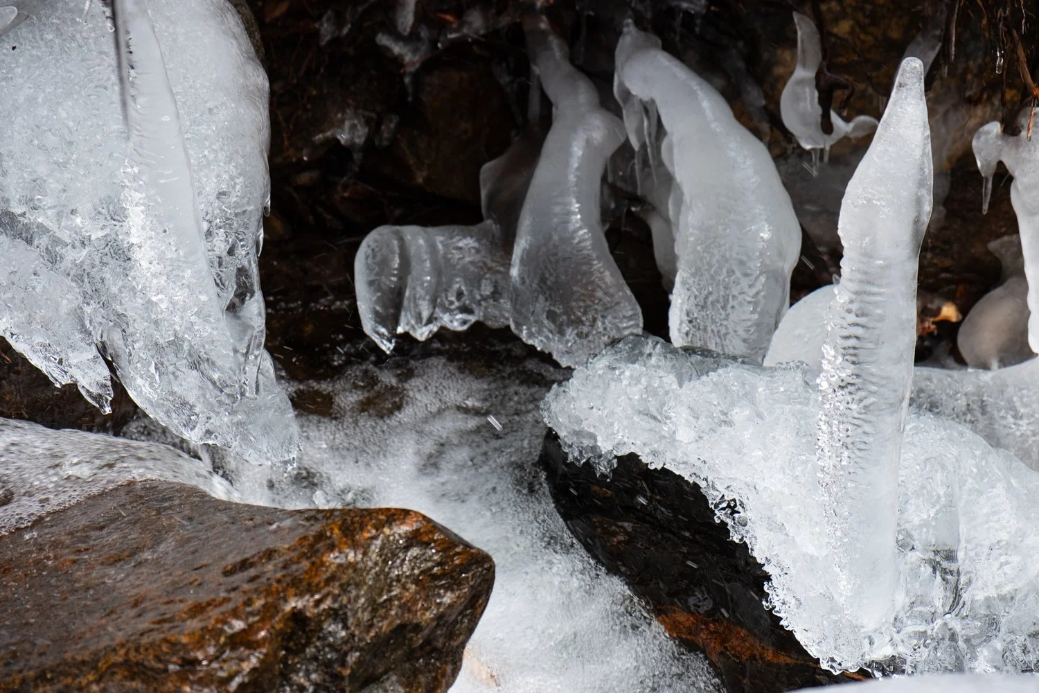 I went in search of potential ice formations, and was not disappointed. I carefully made my way alongside the creek, then across the creek, and eventually ended up in the creek. (Let’s hear it for waterproof boots.) Under a set of large boulders, I found ice hanging in strange shapes, as well as growing upwards. Like stalactites and stalagmites in a cave. The juxtaposition of frozen shapes with splattering and spraying water was entrancing.
