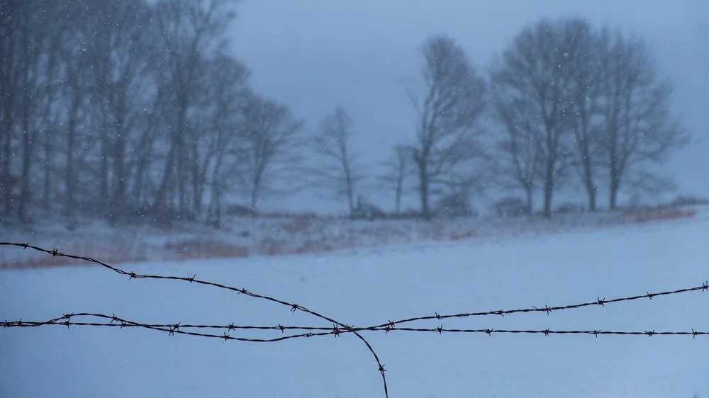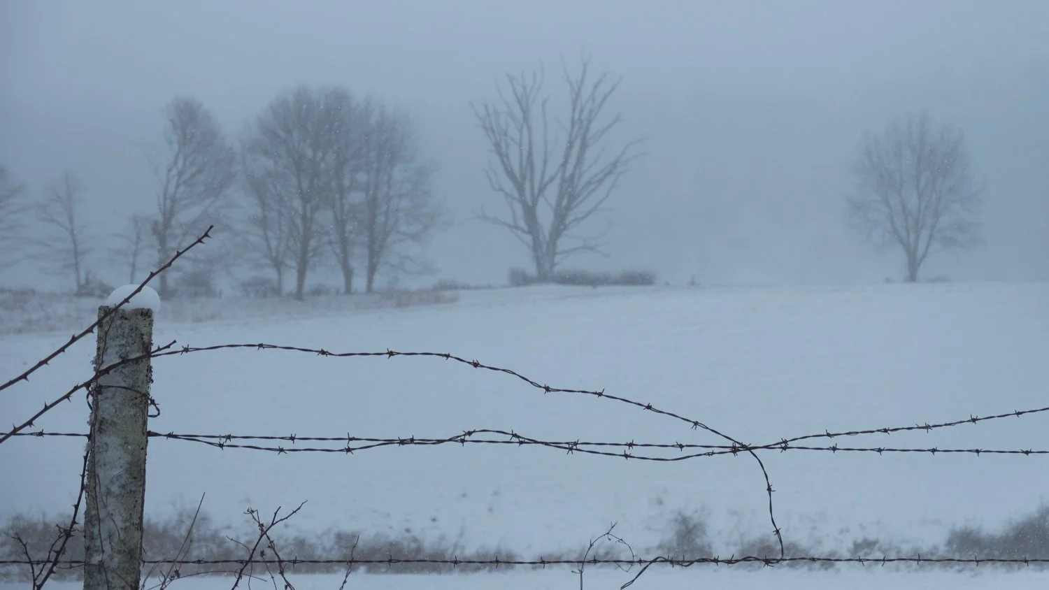 Fenceposts and rusty wire, snowy ridgeline with trees. Julie Williams Dixon 2026